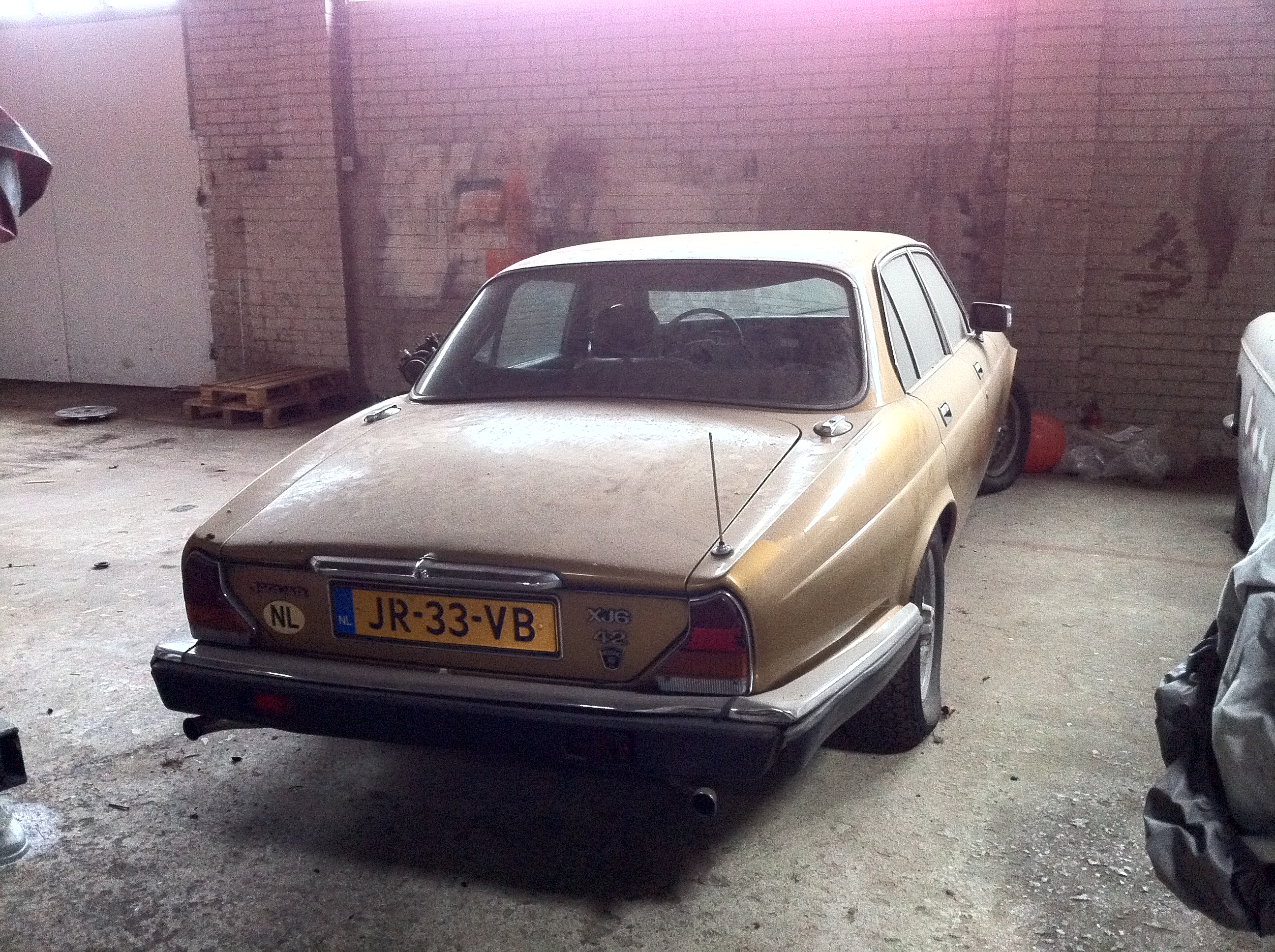 Complete Jaguar XJ6 4.2 (injectie) uit 1983. De auto heeft links voor een aanrijding gehad en het idee was om de auto op te knappen. Vandaar dat er een pallet (gebruikte) plaatdelen bij zit zodat de auto compleet is.